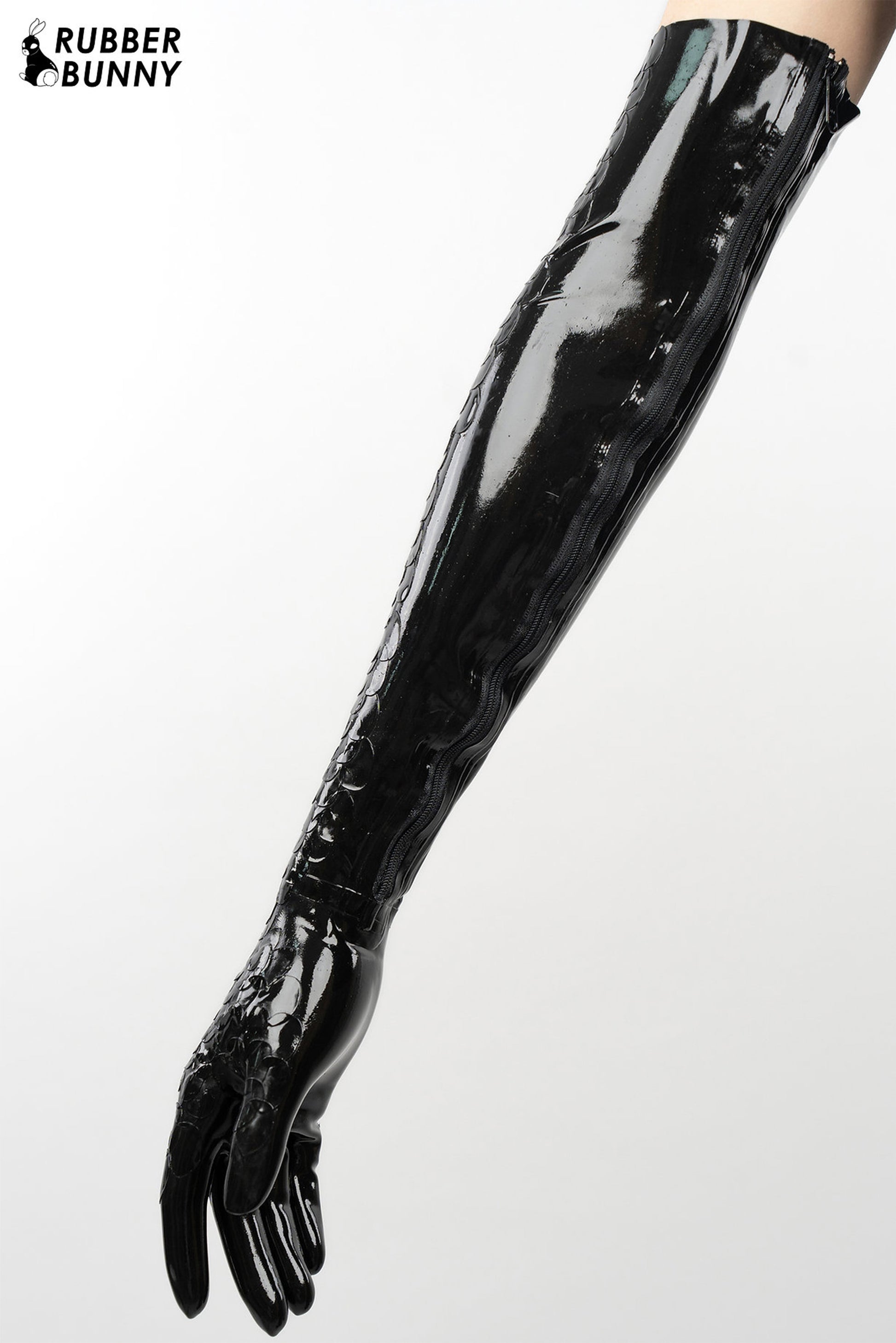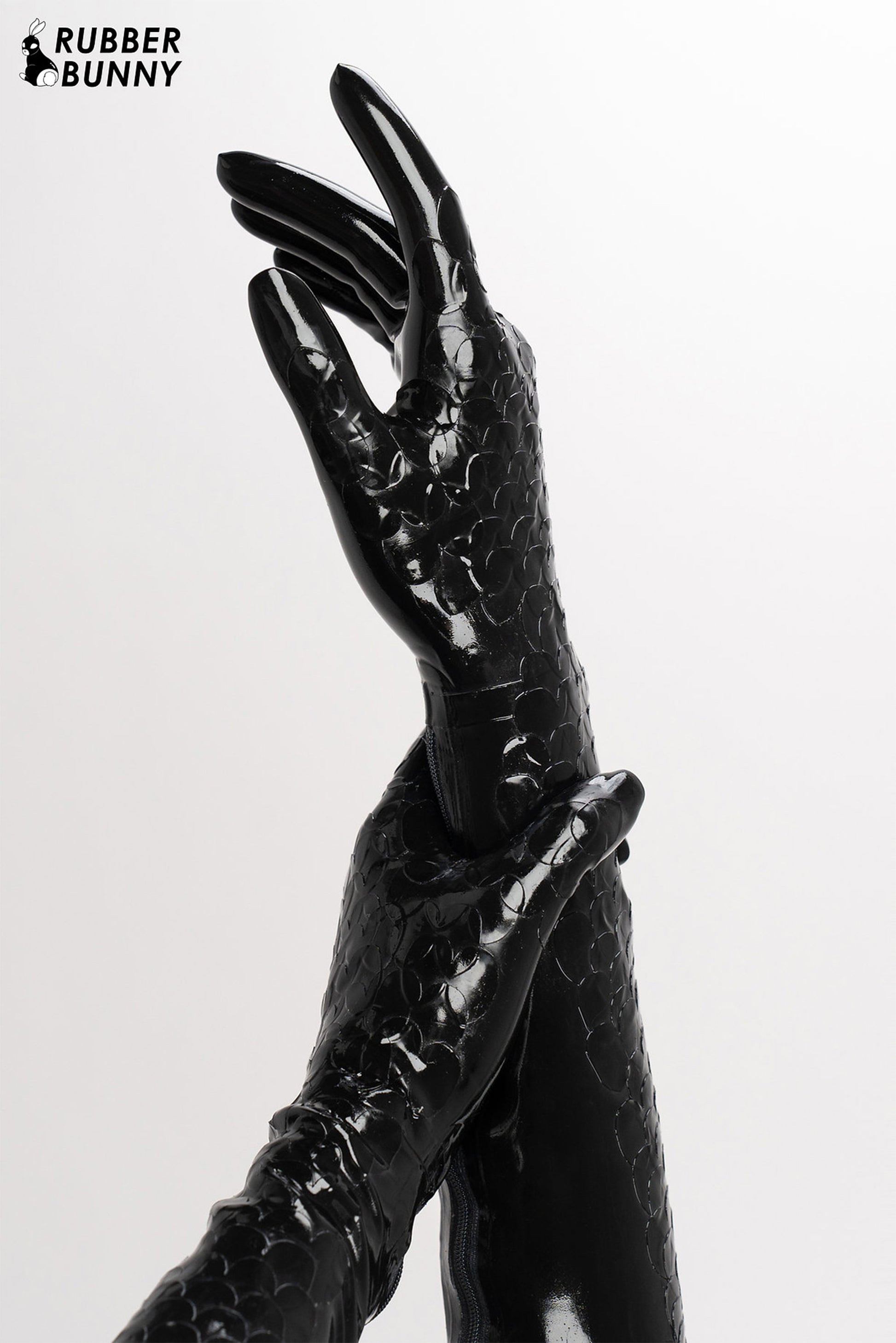 Embrace the ultimate fetish ideal style with this premium latex design, carefully reinforced to fully cover your fingers. Crafted using a seamless one-piece molding process, it offers a unique scaled latex appearance that enhances its visual appeal and durability. Made from high-quality latex material, this piece is comfortable to wear while remaining easy to put on and take off, making it perfect for both personal enjoyment and professional use. Whether you're expanding your latex collection or seeking a bold new look, this design delivers both elegance and functionality.