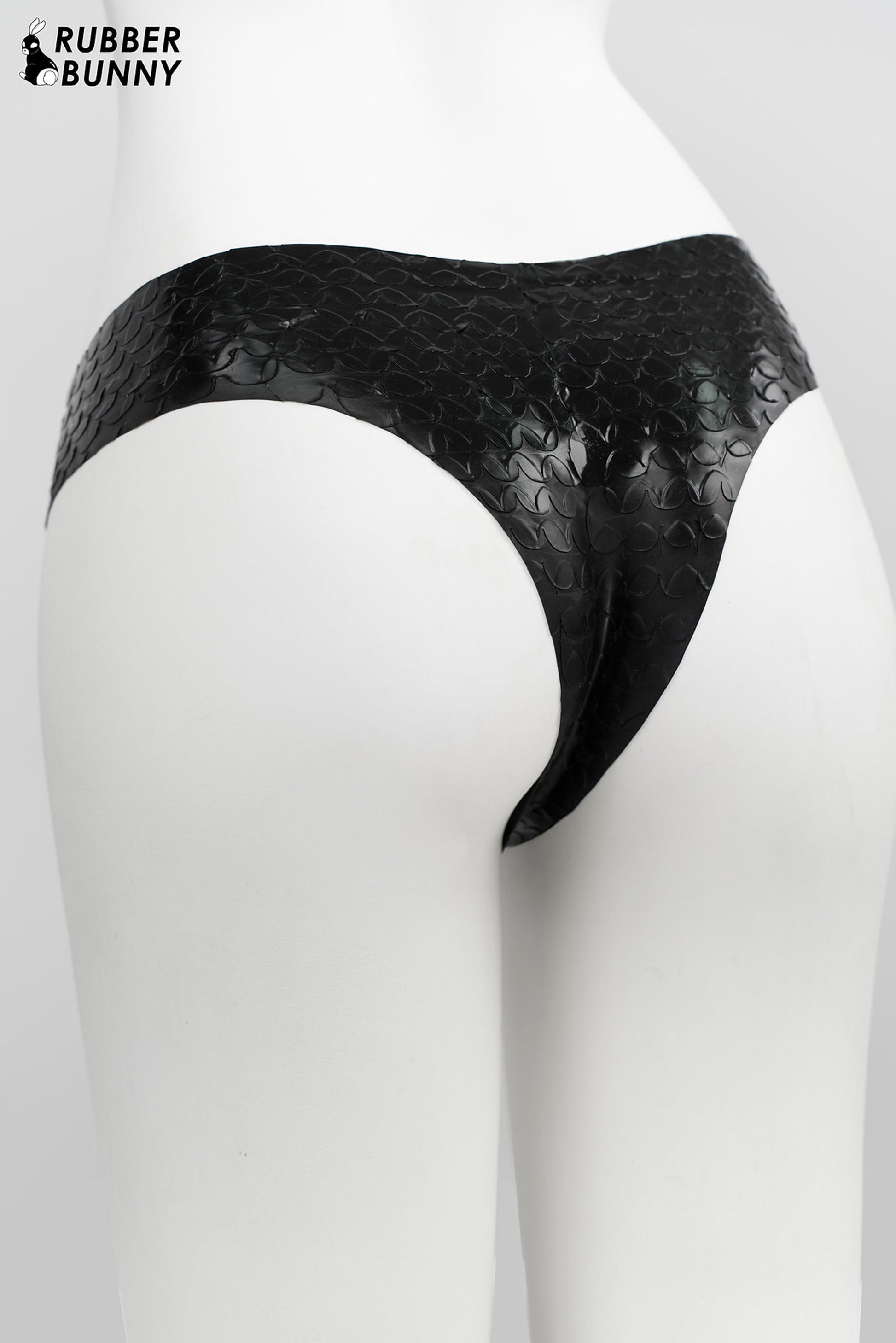 This latex thong embodies bold design and craftsmanship in a striking, sculptural form. Each scale is hand-crafted to create a clean, distinct texture with a seamless finish, forming a smooth, fluid surface that moves naturally with the body.