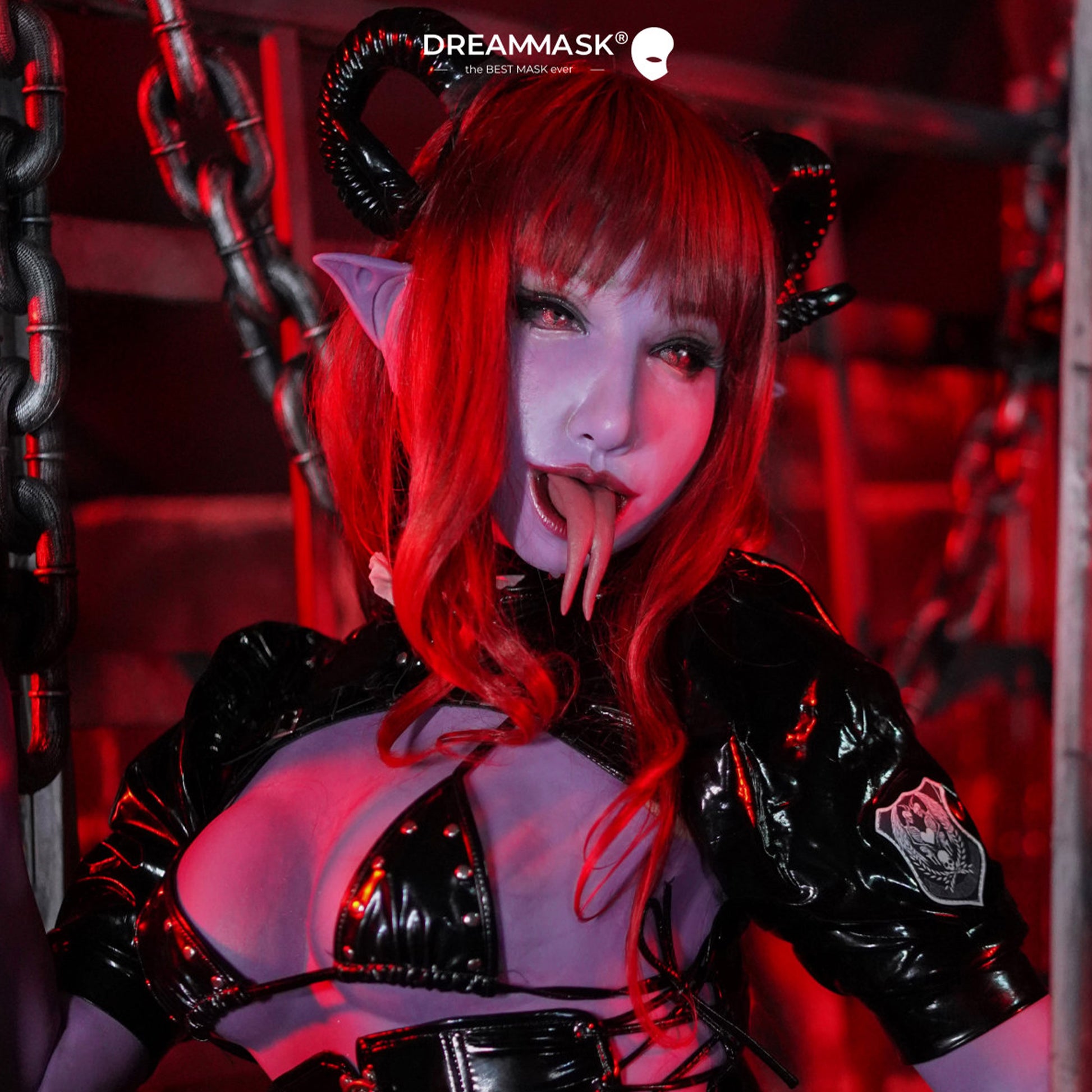 She is a fallen elf, harboring an evil heart beneath her beautiful exterior. Her dark red eyes resemble a bottomless abyss, concealing endless desires. The upward smoky eyeliner adds a mature and sexy touch, while her slightly flushed cheeks betray her sexual excitement. With her snake-like tongue darting out to catch her prey, she's always ready to feast.