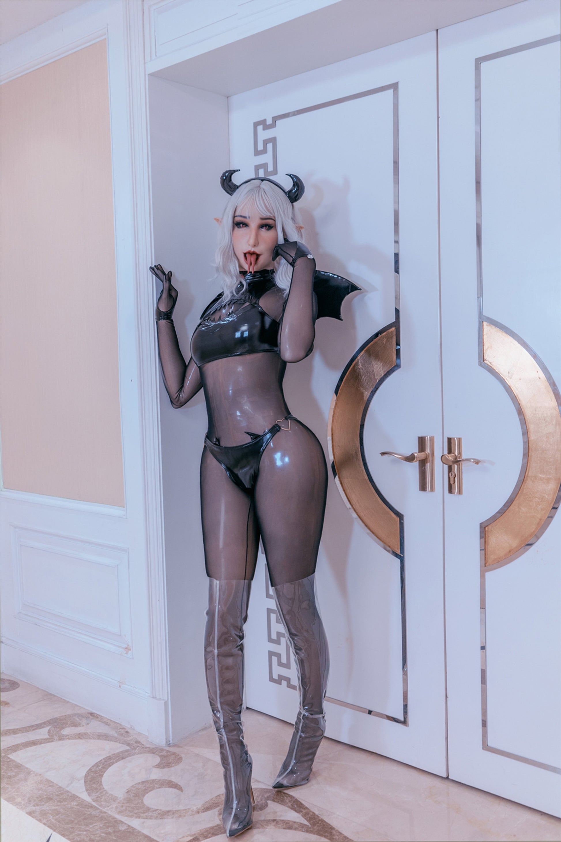 She is a fallen elf, harboring an evil heart beneath her beautiful exterior. Her dark red eyes resemble a bottomless abyss, concealing endless desires. The upward smoky eyeliner adds a mature and sexy touch, while her slightly flushed cheeks betray her sexual excitement. With her snake-like tongue darting out to catch her prey, she's always ready to feast.