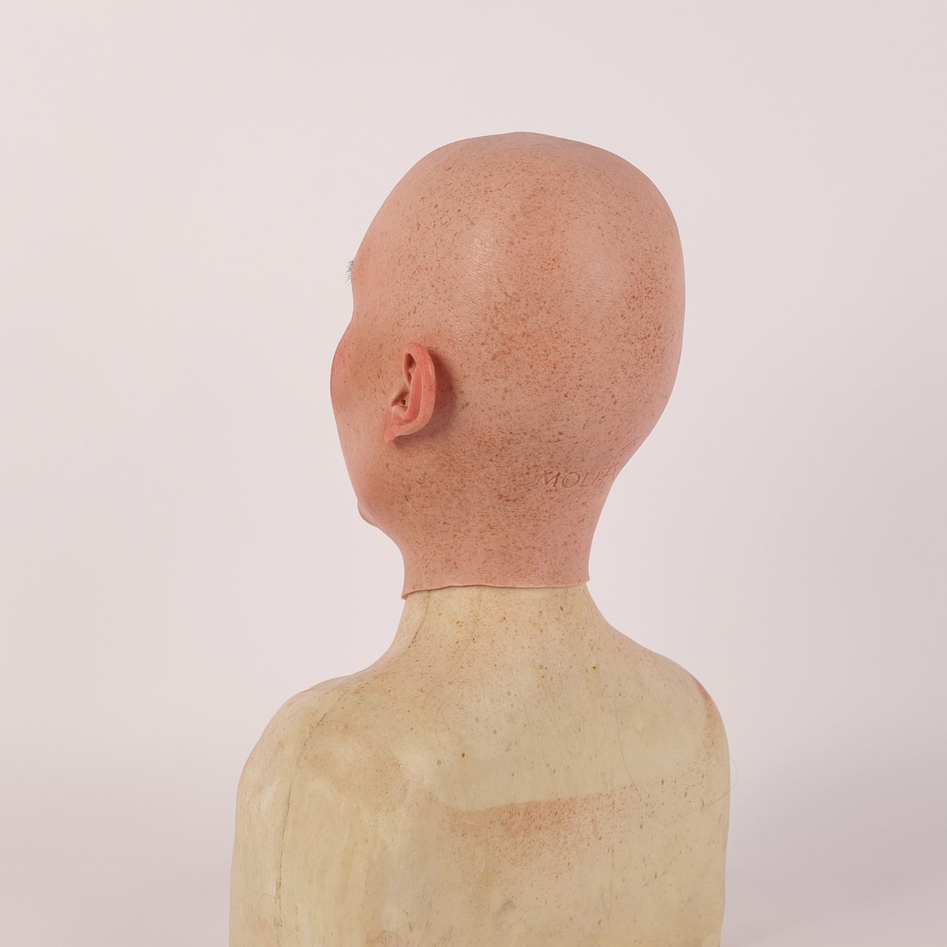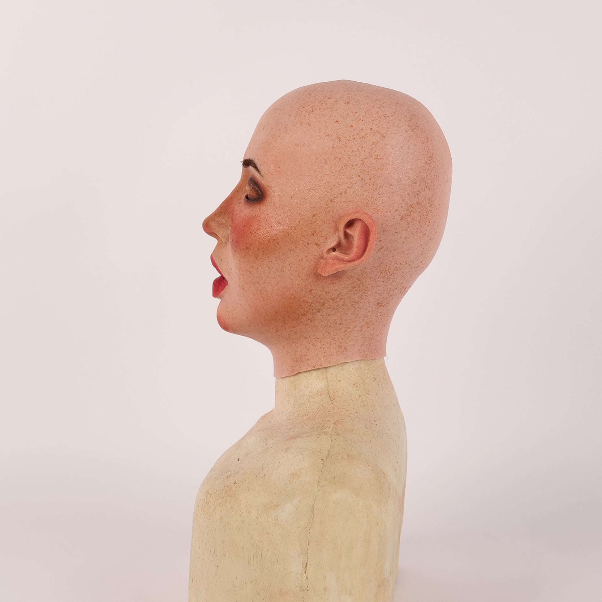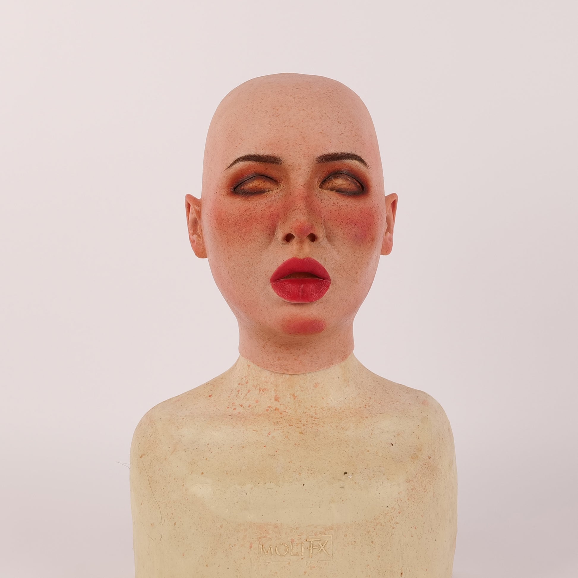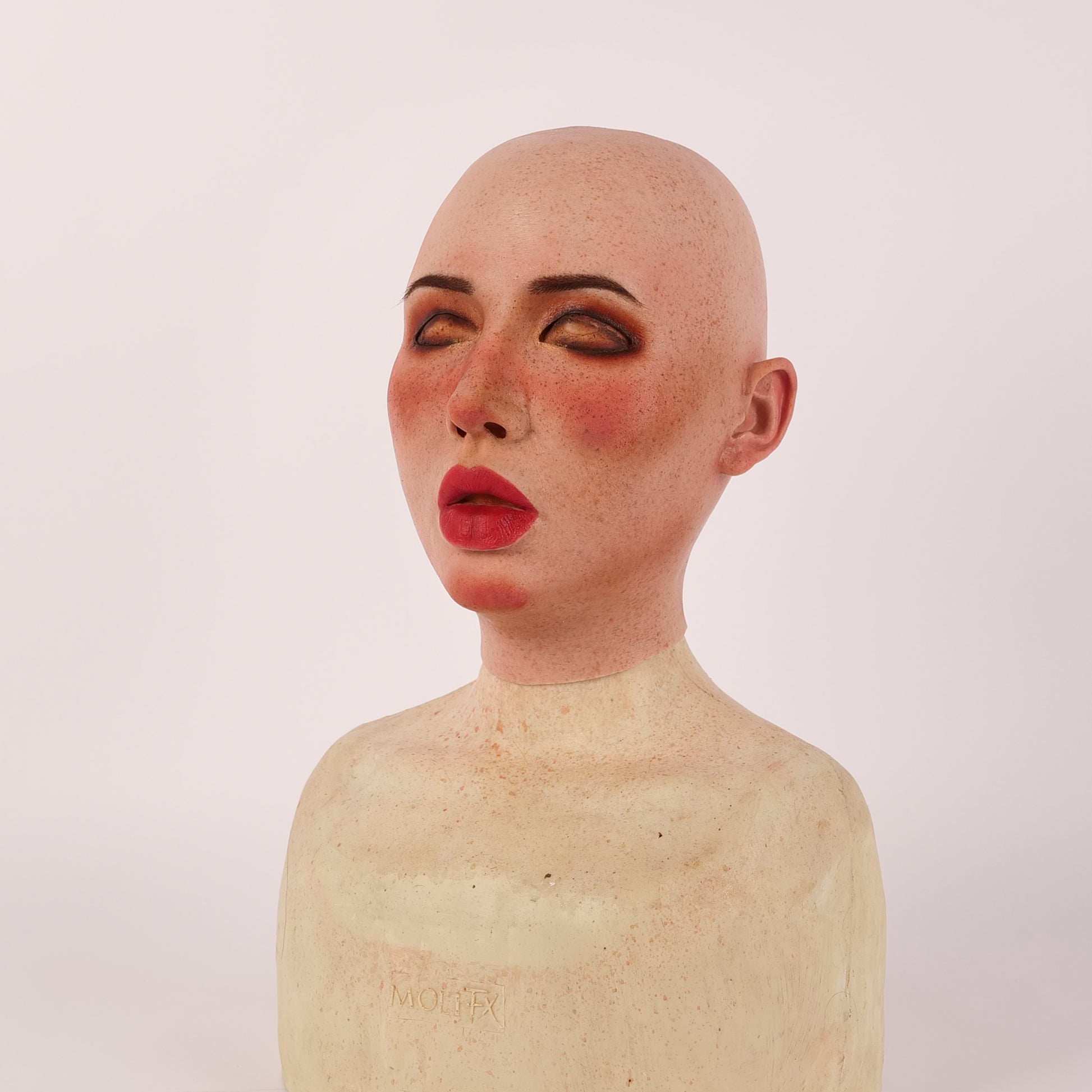 "Molly S" is made of premium raw silicone material, showcasing an unparalleled realistic appearance and performance. Developed with SFX techniques, she boasts impeccable skin details, including realistic pores and eye rims. The "S" stands for small, making Molly S an ideal fit for a smaller head circumference. It meets the standards of special effects makeup, featuring eye rims with a thickness of less than 0.5 mm.